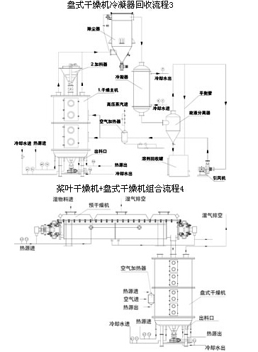 1 濕物料 2 定量加料器 3 連續(xù)球閥進(jìn)料 4 真空盤式干燥機(jī)5 冷凝器 6 加熱介質(zhì)進(jìn) 7 加熱介質(zhì)出8 溶劑接收器9 真空泵10 干品11 冷卻介質(zhì)進(jìn)12 冷卻介質(zhì)進(jìn)13 尾氣排空