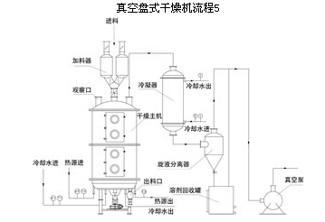真空盤式干燥機(jī)流程適用于干燥溫度要求很低的熱敏性物料的干燥,如藥品、維生素、生物制品、酶,含溶劑物料等。濕物料分批加入到能耐負(fù)壓的定量加料器中,開啟真 空泵,使盤式干燥器呈負(fù)壓狀態(tài)后,通過連續(xù)閉鎖器將物料均勻加入干燥器中進(jìn)行干燥作業(yè),干燥后的物料從干燥器底部的出料口排出。從物 料中逸出的濕份經(jīng)冷凝器和溶劑接受罐進(jìn)行回收,整個(gè)操作過程在負(fù)壓下進(jìn)行。
